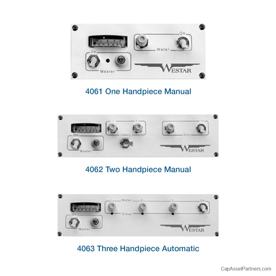 Discover the exceptional versatility and superior performance of the Westar Panel Mount Delivery Systems, designed to meet the diverse needs of modern medical practices. Offering a range of configurations, including the 4061 One Handpiece Manual, 4062 Two Handpiece Manual, and 4063 Three Handpiece Automatic models, these systems are tailored for optimal functionality and user experience.